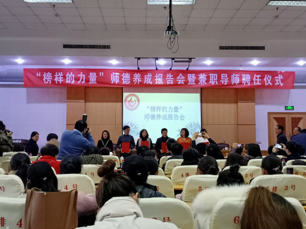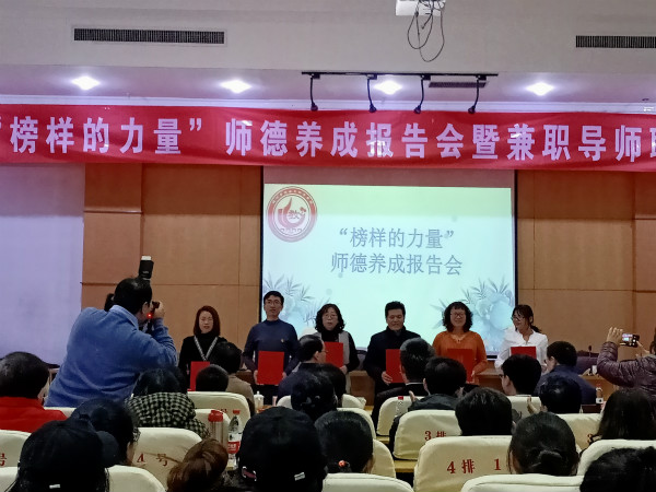 为促进太阳成集团tyc33455cc教育科学学院学子以教师为榜样、培养师德品质,太阳成集团tyc33455cc教育科学学院于12月12日在厚德楼四楼报告厅成功举办“榜样的力量”师德养成报告会暨兼职导师聘任仪式。