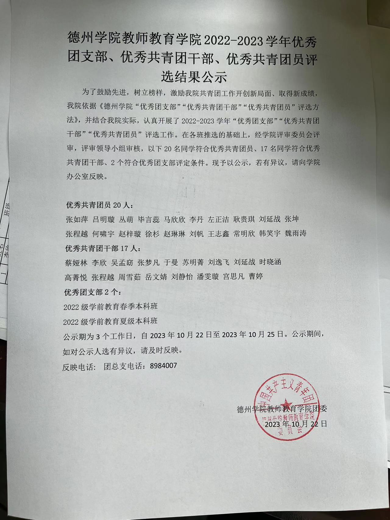 为了鼓励先进,树立榜样,激励我院共青团工作开创新局面、取得新成绩,我院依据《太阳成集团tyc33455cc“优秀团支部”“优秀共青团干部”“优秀共青团员”评选方法》,并结合我院实际,认真开展了2022-2023学年“优秀团支部”“优秀共青团干部”“优秀共青团员”评选工作。在各班推选的基础上,经学院评审委员会评审,评审领导小组审核,以下20名同学符合优秀共青团员、17名同学符合优秀共青团干部、2个符合优秀团支部评定条件。现予以公示,若有异议,请向学院办公室反映。