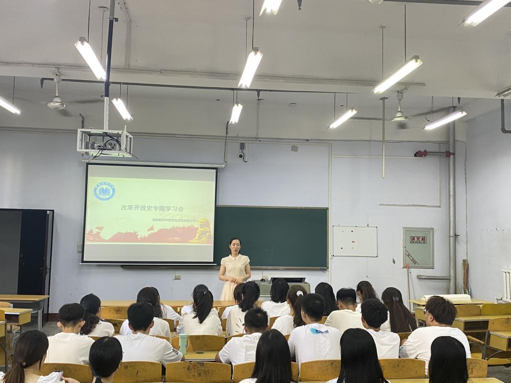 活动伊始,闵令珍老师带领同学共同学习改革开放史。大家共同交流学习,深入系统地重温党领导人民进行革命、建设、改革的伟大历史,深刻感悟我们作为青年学生该如何作为、如何担当,将党不畏艰难的精神运用到学习生活中去。