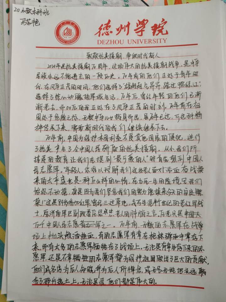 活动伊始,主要负责人共同协商策划,并下达通知,由各班负责人向学生们传达此次活动的目的及意义,呼吁学生积极报名参加。活动中期,学生们凭借自己观看的抗美援朝视频及相关资料认真写下自己的心得感受,抒发对抗美援朝英雄人物的情感。活动后期,由各班班长收齐参赛稿件送至知行楼活动室,对参赛作品按评分标准进行评奖。参赛学生彼此交流,表达对抗美援朝英雄人物精神的致敬,励志做一名时代新人。