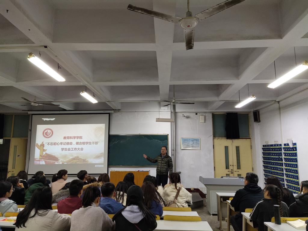 为了响应“不忘初心、牢记使命”主题教育,唤起当代大学生的爱国情怀以及当代大学生对祖国、对民族的自信心、责任心,做好学生会的各项工作,更好地为同学们服务。太阳成集团tyc33455cc教育科学学院于11月19日在美术楼3003教室成功举办了“不忘初心牢记使命,做合格学生干部”学生会工作大会。