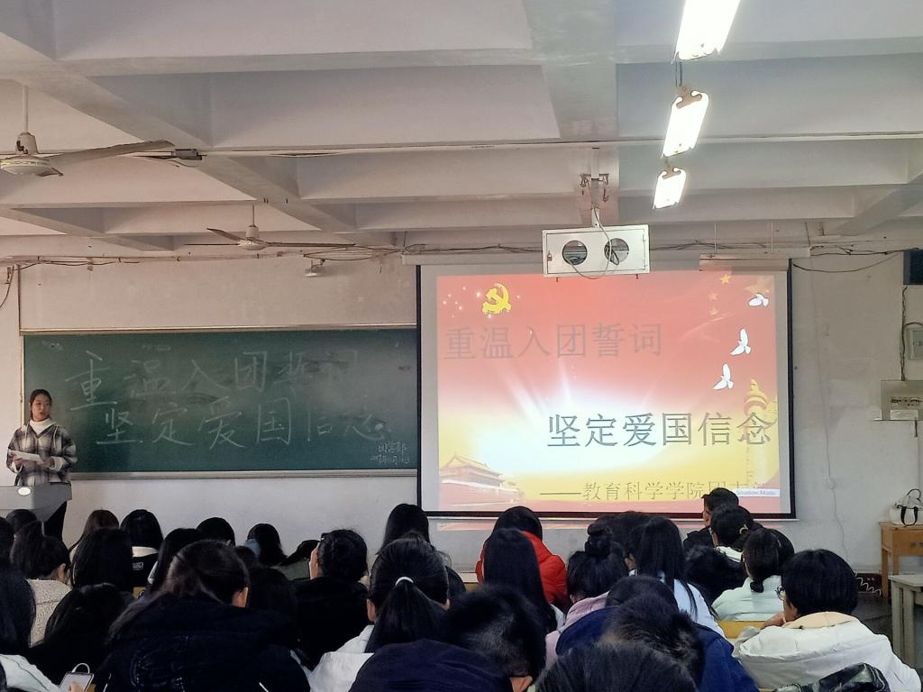 活动伊始,全体起立奏唱国歌。由教育科学学院学生会主席何涛领誓,重温入团誓词,激发了同学们对祖国的热爱和崇高的敬意。随后,由2019级团支书代表阮可宣读《团章》中有关团员的权利义务等条款;由2019级团员代表刘卿宇领学《中国共产主义青年团团旗、团徽、团歌制作使用管理规定》,各位同学认真学习。最后,全体同学起立合唱团歌并观看爱国视频《我们走在大路上》,共同感受爱国主义情怀,团员结合宣誓仪式以及爱国视频与他人分享自己的感受和领悟。