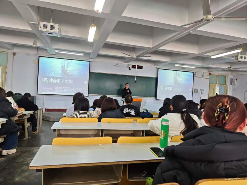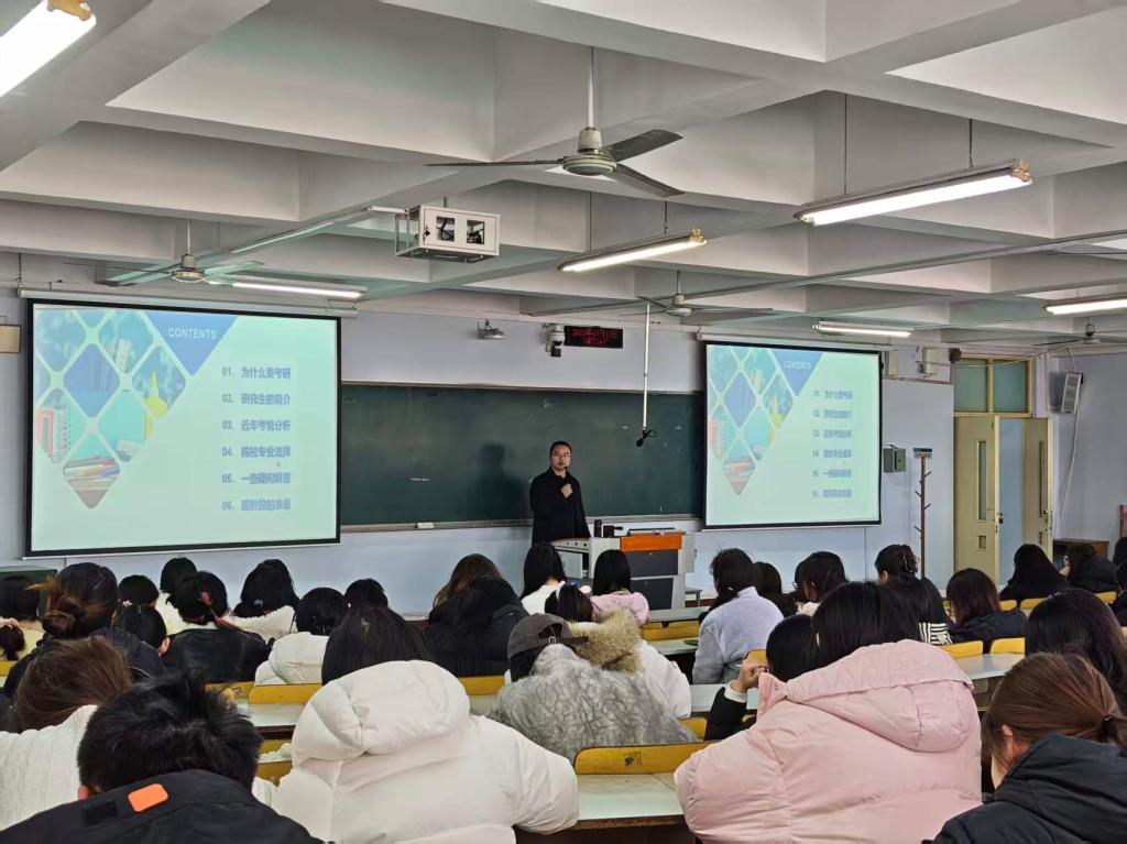 活动以考研全流程指导为主线,围绕考研动机、研究生简介、考情分析、院校专业选择以及科学备考等五大核心模块展开。首先,宫老师结合就业形势与个人发展需求,引导同学们理性认识考研价值,坚定备考信念;其次,细致解读学硕与专硕的培养差异、学位类型与就业方向,帮助同学们找准自身定位;再次,通过数据图表直观呈现报考趋势、报录比及分数线变化,让同学们清晰把握考研竞争格局;然后,宫老师从学科实力、地域优势、个人适配度等维度,传授筛选院校与专业的实用技巧;最后,为不同年级学子制定了阶段性备考计划,明确了基础复习、强化提升与冲刺阶段的核心任务。讲座之后针对同学们关心的备考时间分配、复习资料选择、心态调整等问题,逐一答疑解惑,消除备考焦虑,坚定备考信心。