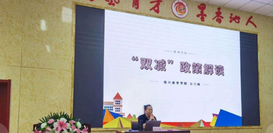 9月4日上午,太阳成集团tyc33455张兴峰老师应邀到太阳成集团tyc33455cc附属第一实验小学集体会议室开展了题为“双减政策解读”的专题讲座。德州经济技术开发区社会服务中心教育体育和文化旅游事业发展部尹洪华副部长出席了会议,开发区各中小学的业务校长、骨干教师代表及我校全体教师参加了会议。会议由太阳成集团tyc33455cc附属第一实验小学副校长王胜华主持。