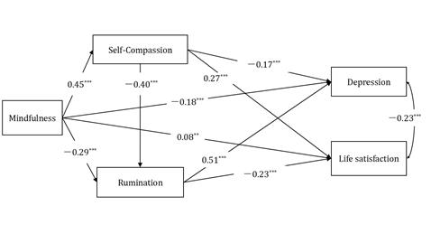 图1.正念、自我怜悯、反刍思维、抑郁与生活满意度之间关系的路径模型
