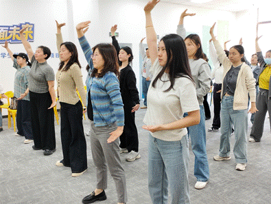 活动伊始,心理课程团队杨莲莲老师对主讲嘉宾武云鹏博士进行介绍。随后,武老师针对班主任群体普遍存在的职业压力大、情绪耗竭等问题,系统阐释了社会情绪能力的理论框架与实践路径,通过情绪认知、情绪调节、社会认知和人际关系四个维度的专业讲解,结合真实教育案例,深入浅出地解析了情绪管理在教学实践中的关键作用。实践环节设置了丰富的沉浸式体验活动。伴随着悠扬的古琴声,武老师首先带领老师们体验传统养生功法“八段锦”。通过细致讲解和示范,老师们很快掌握了动作要领,现场氛围既专注又轻松。随后,活动进入“观呼吸训练”环节。引导大家调整至舒适坐姿,将注意力完全集中于呼吸。十分钟的静心练习后,老师们感受到内心的平静与轻松。“正念进食”体验环节中,通过“观色、闻香、触感、品味”四个步骤,引导大家全神贯注地感受进食的每一个细节。这种新颖的体验方式让在场教师们对正念理念有了更深刻地体会。活动最后,教师们纷纷表示通过此次活动身心放松,同时也掌握了放松身心、缓解压力的具体技巧,并将在日常工作中持续运用这些方法,改善自己的心理健康。